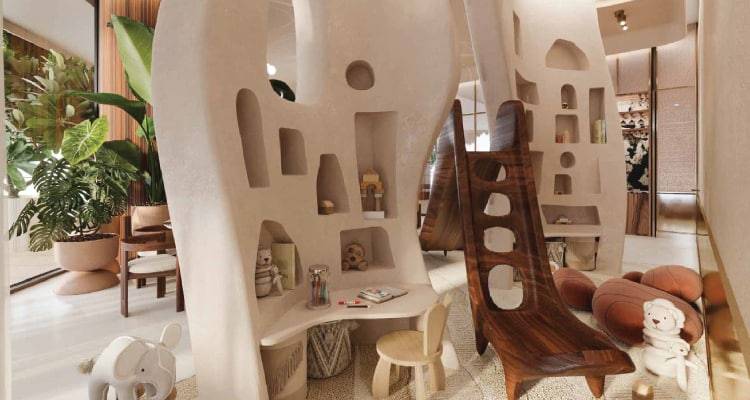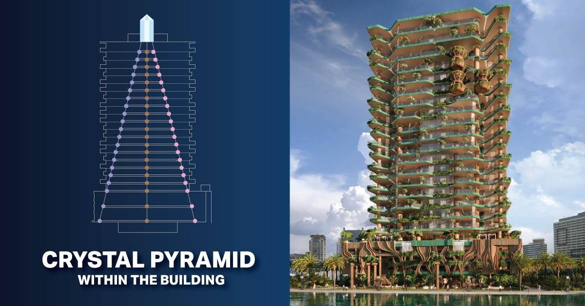 Eywa is an organic Tree of Life in its design, but with a magical inner heart. An incredible first-of-a-kind positive energy structure is embedded within the structure of the building. 1,450 specific crystals, geodes and precious stones are placed in columns and concrete slabs from the bottom to the top of the building in a unique pyramid shape in complete alignment with Vaastu Shastra principles. These crystals and stones of varying natures and specific sizes enhance the positive energy on each floor while purifying and eliminating negative energy, promoting harmony, health and well being for the residents of Eywa.