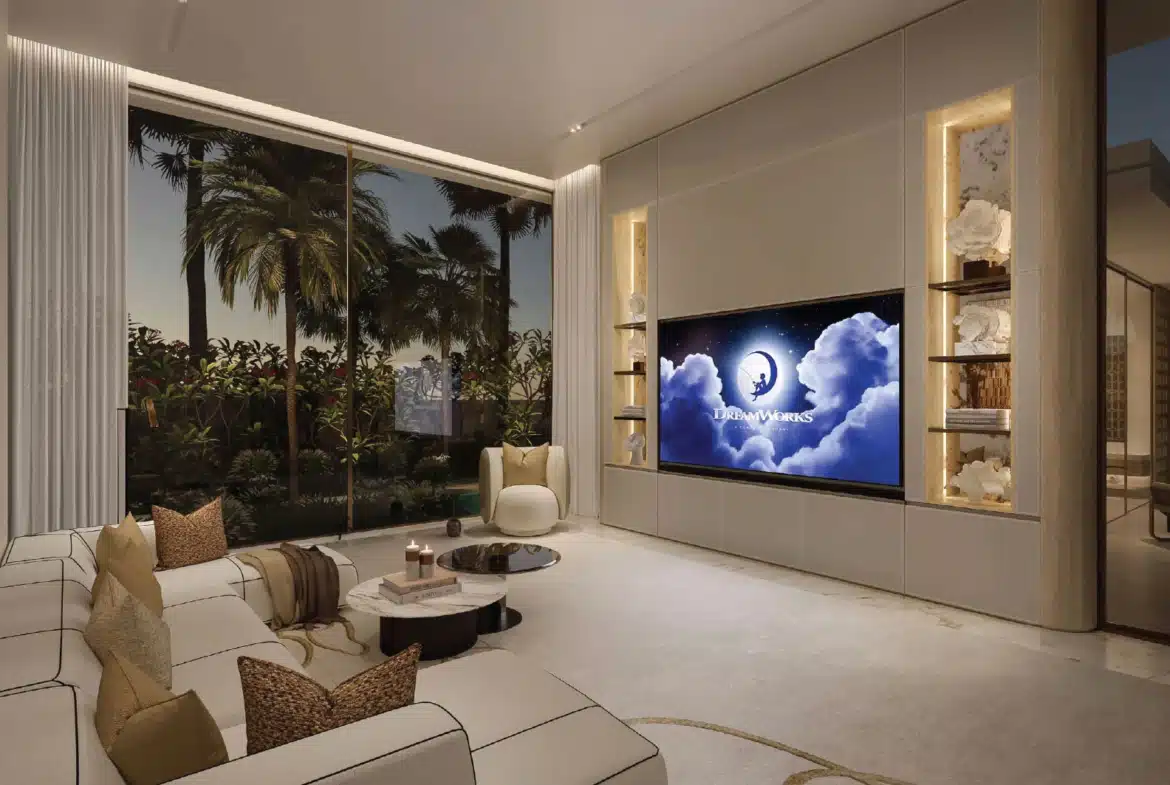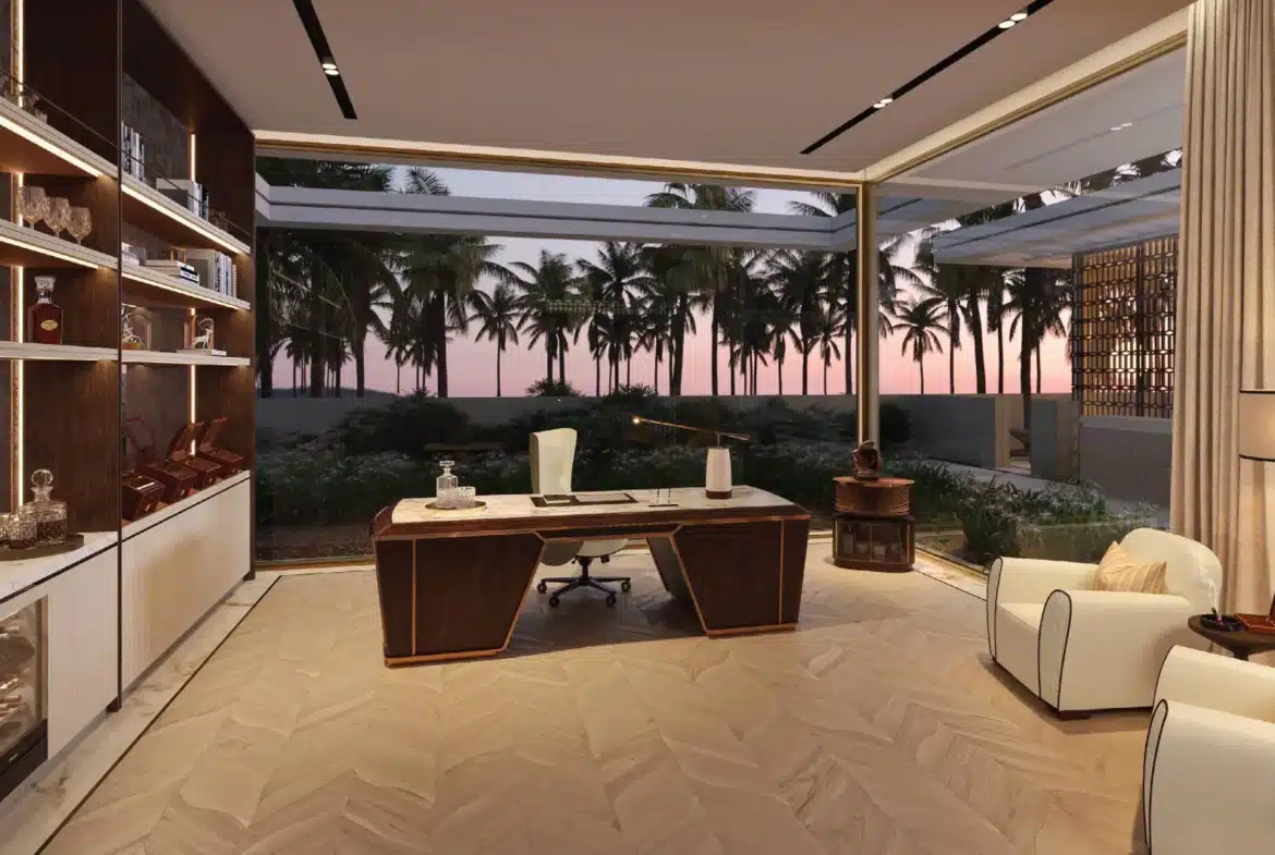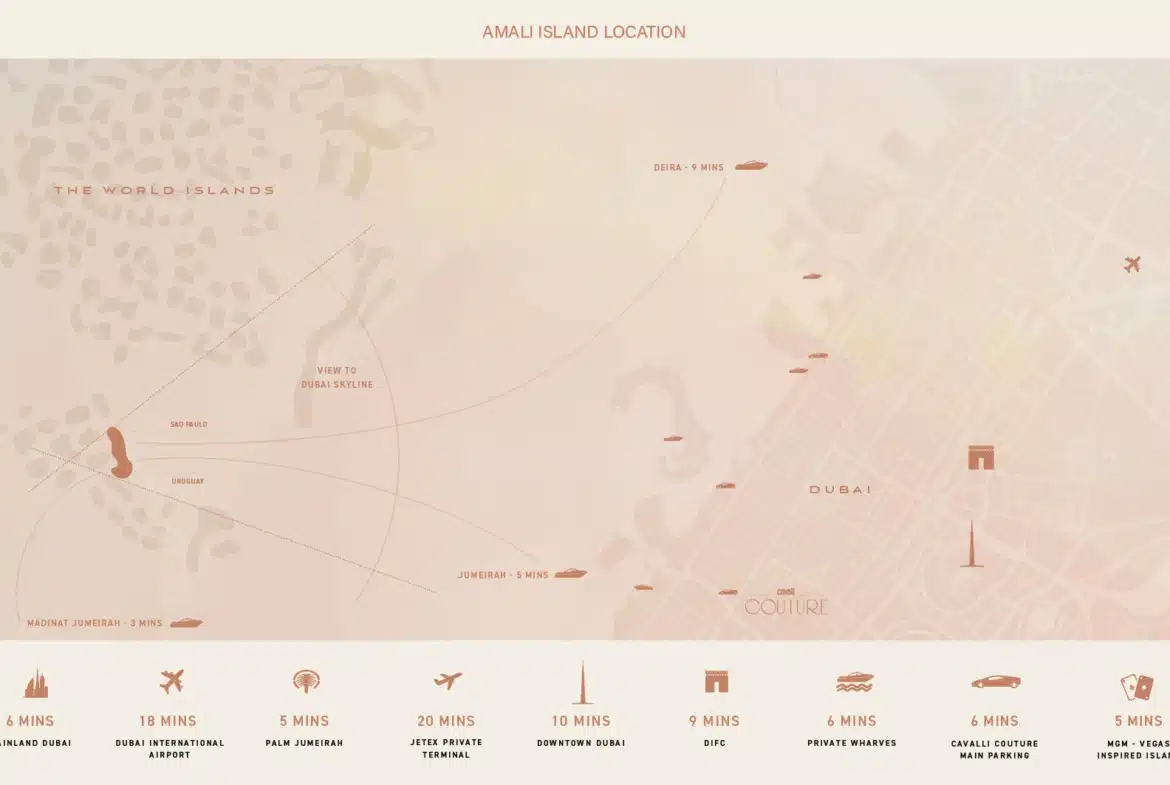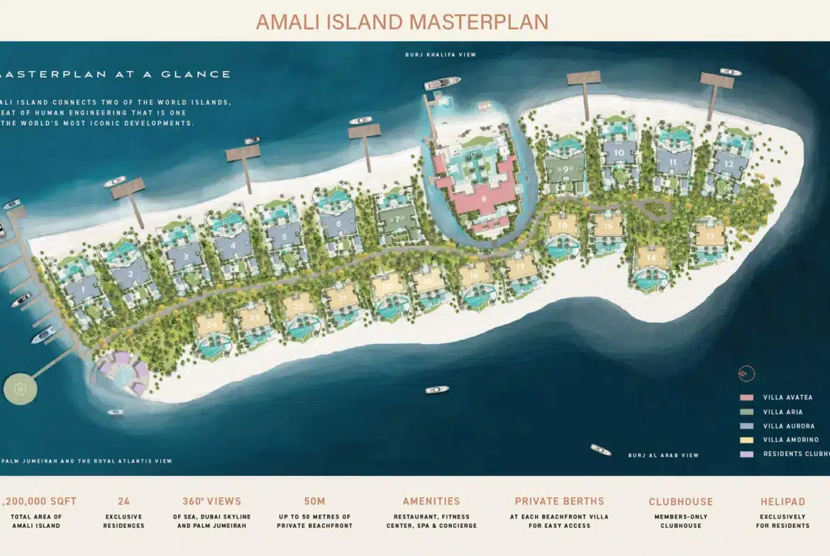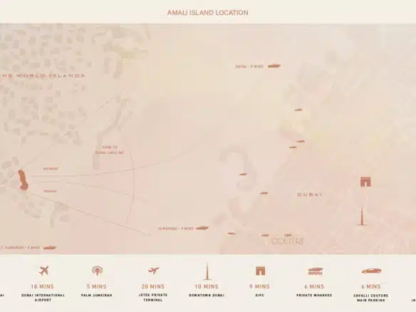 Amali Island is an exclusive community on The World Islands. This exceptional six-bedroom mansion offers VIP clients not only a prestigious retreat but also a serene escape from the city’s hustle and pollution. Set on a one-of-a-kind island, it provides luxurious living with private beach access and stunning views of the Burj Khalifa and Dubai skyline. The Aurora Mansion at Amali Island features: