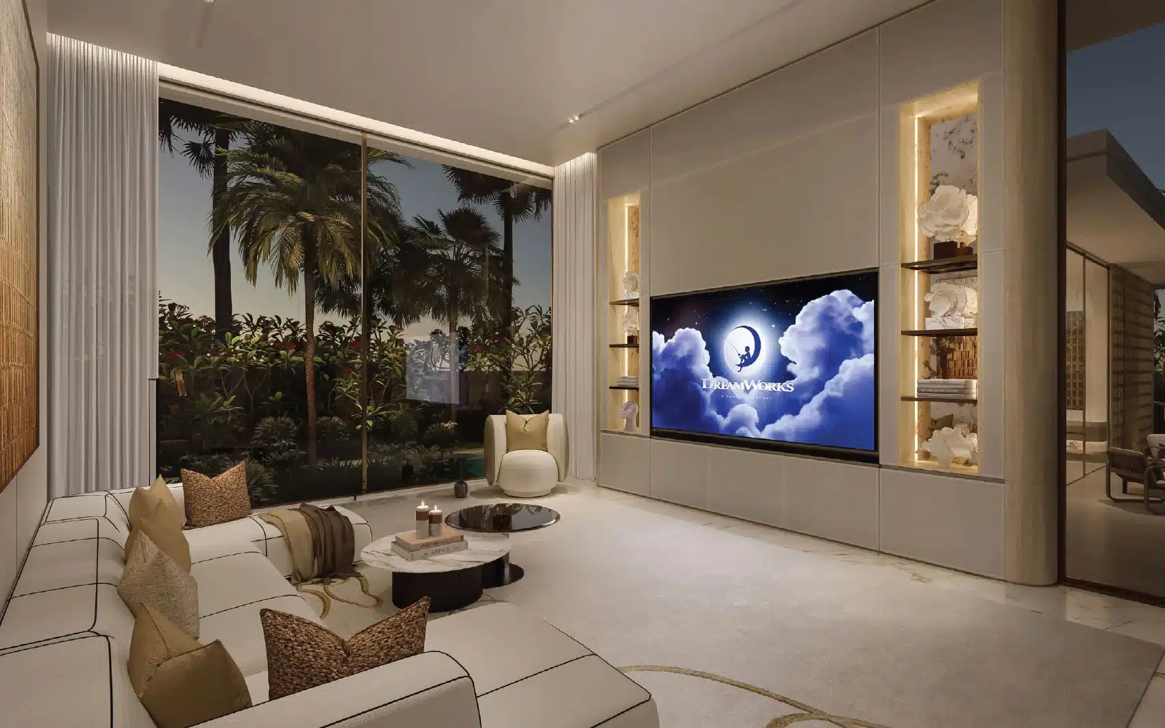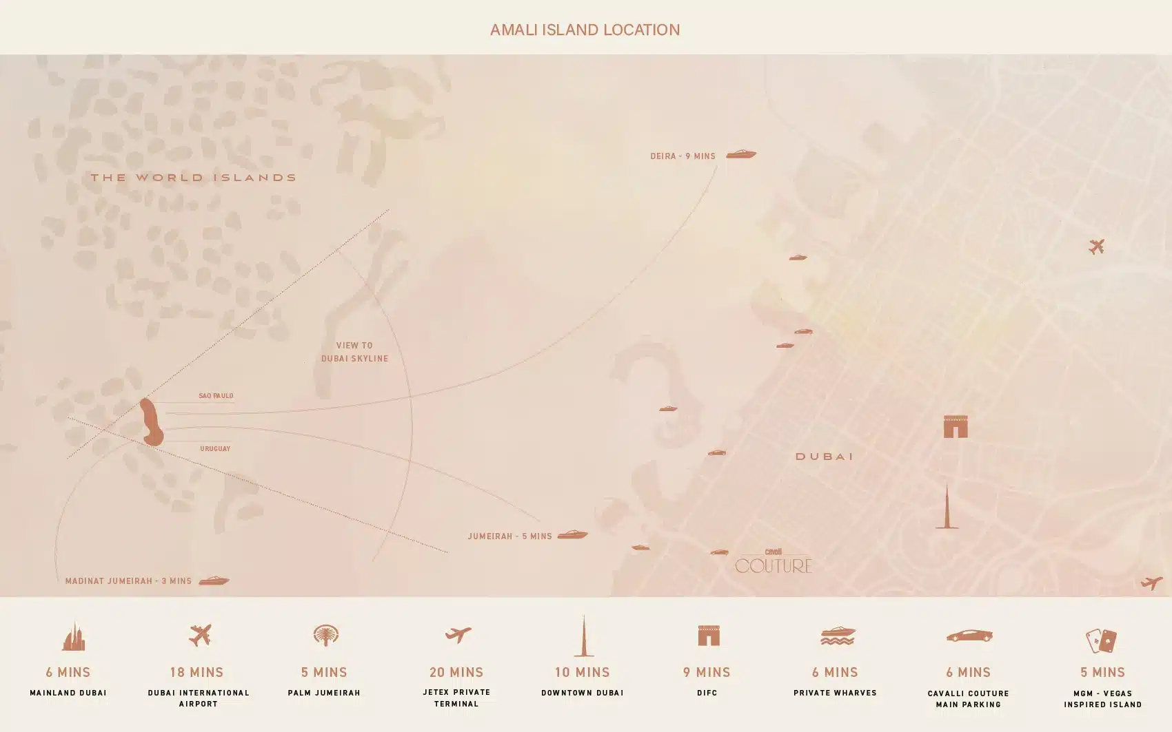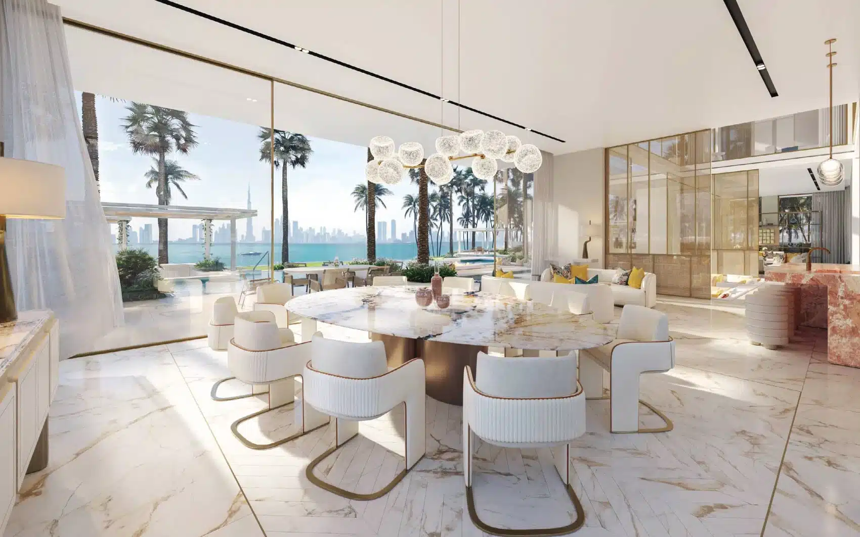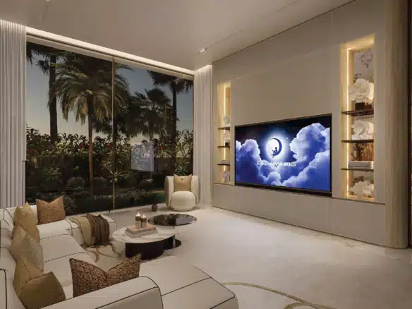 Amali Island is an exclusive community on The World Islands. This exceptional six-bedroom mansion offers VIP clients not only a prestigious retreat but also a serene escape from the city’s hustle and pollution. Set on a one-of-a-kind island, it provides luxurious living with private beach access and stunning views of the Burj Khalifa and Dubai skyline. The Aurora Mansion at Amali Island features: