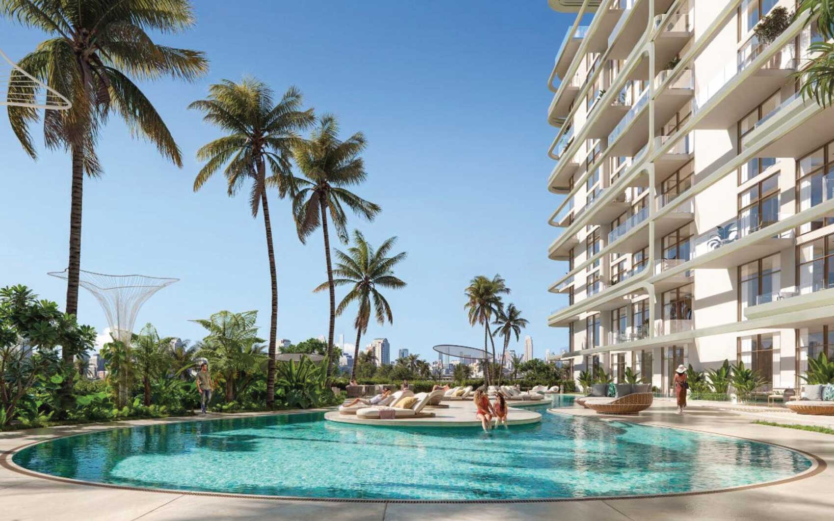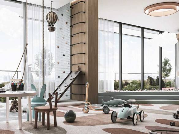 The complex boasts a comprehensive range of premium resort-style amenities, including a lagoon pool with a dedicated children’s area on the podium, a rooftop infinity pool accompanied by a lounge and barbecue zone, a fully equipped fitness center, multiple sports courts, and vibrant playgrounds for children.