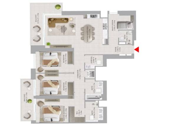 Discover a 3-bedroom corner apartment with maid’s room at VALO, located in Dubai Creek Harbour, by Emaar Properties. This apartment features a maid’s room, ensuite bedrooms, a walk-in closet, a laundry room, a fully fitted kitchen with appliances, and two balconies with pool and park views.