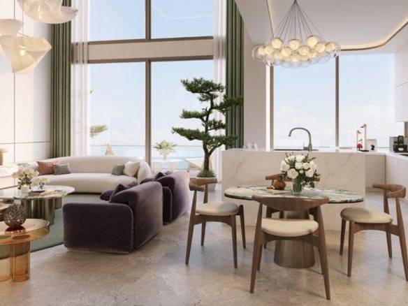Elle Residences showcases sculptural architecture with sweeping panoramic facades and comprises a ground floor, a two-level podium, and ten residential levels. apartments ranging from one to three bedrooms, alongside exclusive townhouses. Each residence is thoughtfully designed to combine elegance with practicality, fully equipped to meet modern living standards. Expansive panoramic windows transform every moment into a stunning visual experience, offering breath-taking views of the marina and the horizon.
