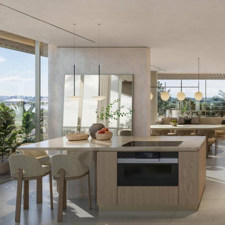Palm Central Private Residences, architecture and nature exist in perfect harmony. The stepped architectural design forms a striking silhouette, thoughtfully crafted to maximise panoramic views, ensure privacy, and enhance the seamless connection to nature. The upper levels showcase luxurious penthouses with expansive terraces and breathtaking vistas, while the structure harmoniously blends with its coastal surroundings.