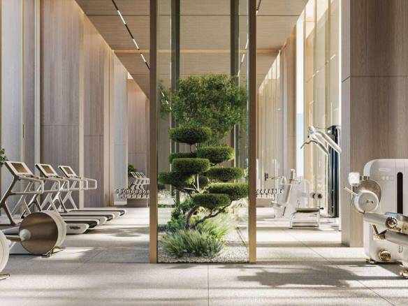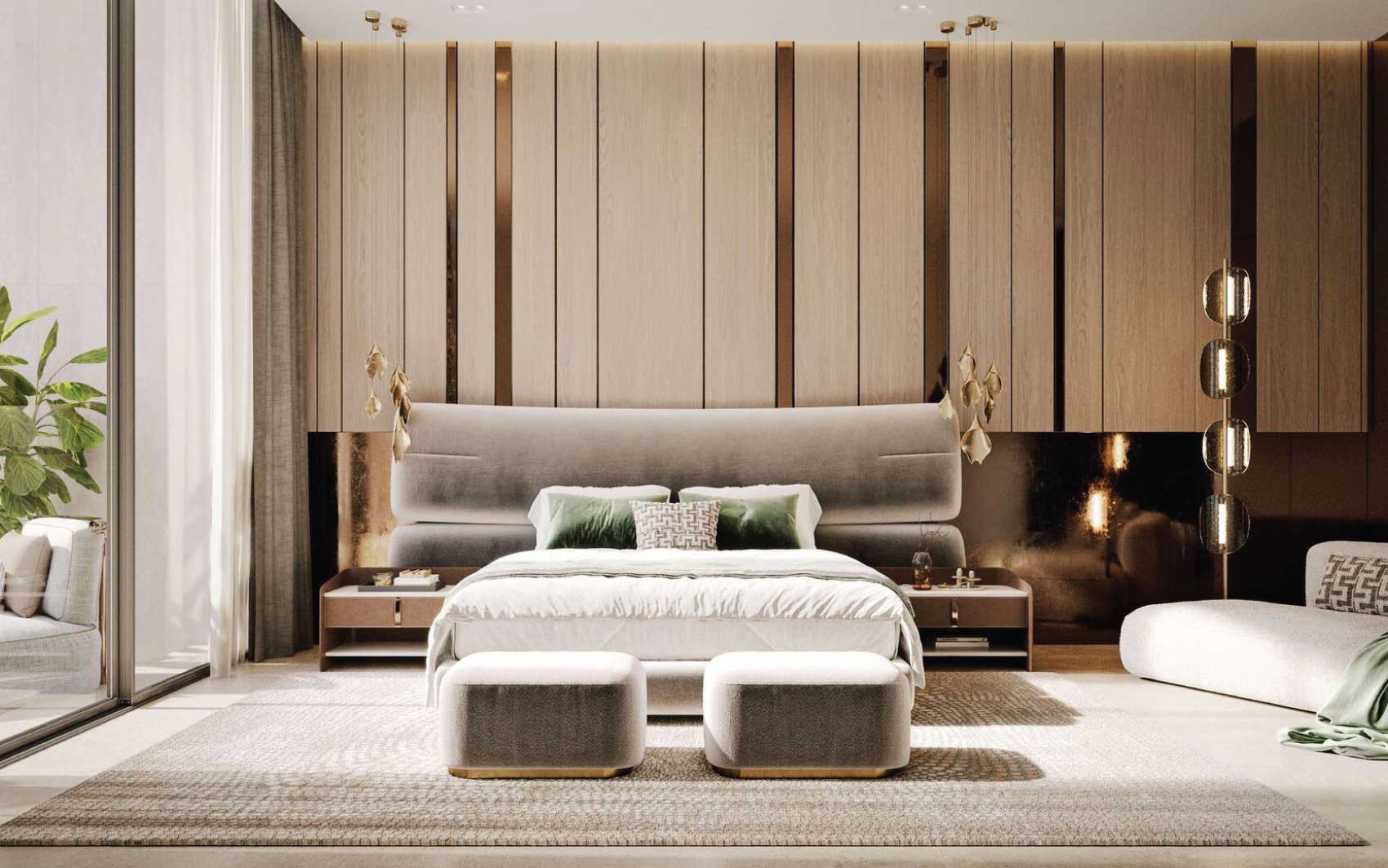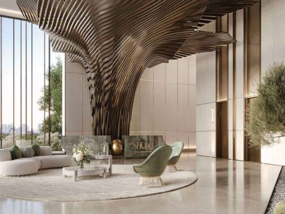 Explore the two-bedroom Shoaq Luxury Residences, the development delivers a contemporary living experience in a prime located setting. The interior features elegant wood paneling, porcelain, and bronze accents, coming together to evoke a sense of timeless sophistication. Emerald tones and rich brown glass capture the serenity of a sunset, graceful and stylish look with a deep emotional resonance.