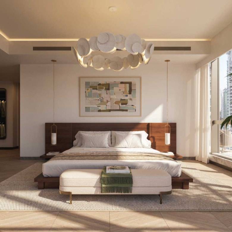 The complex boasts an exceptional array of amenities, from a private beach club, spa with sauna and hammam, to a state-of-the-art fitness center, yoga studio, cinema, coworking lounge, and golf simulator.