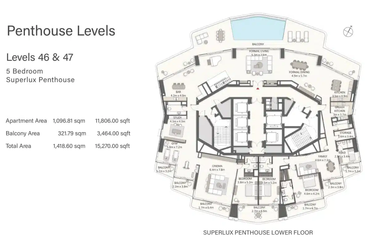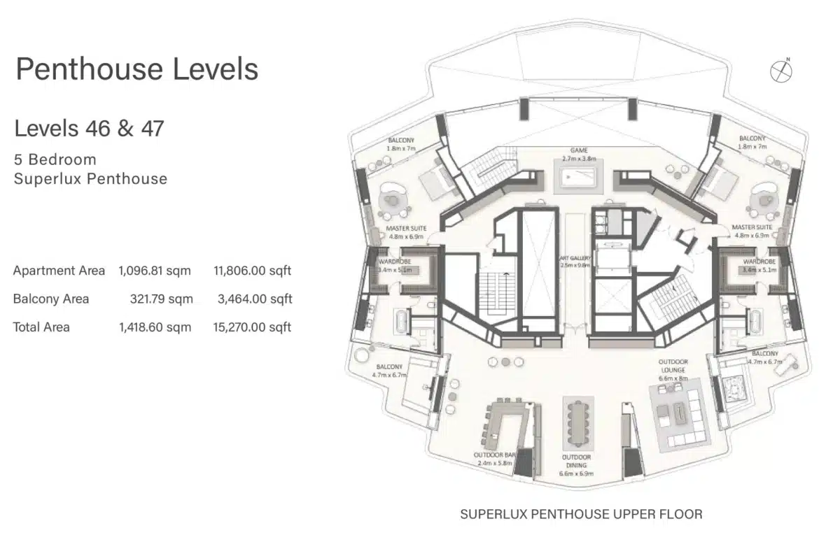 A One of a kind 5 bedroom SuperLux Penthouse for sale in Dubai Marina. The top two floors of this masterpiece, totaling 15,270 square feet. The SuperLux Penthouse has the largest private infinity pool, stunning skyline views and entertainment spaces. Private Massage Areas and Zen Gardens, Outdoor Jacuzzi & Sun-Lounging all in your own private terraces of your Penthouse.