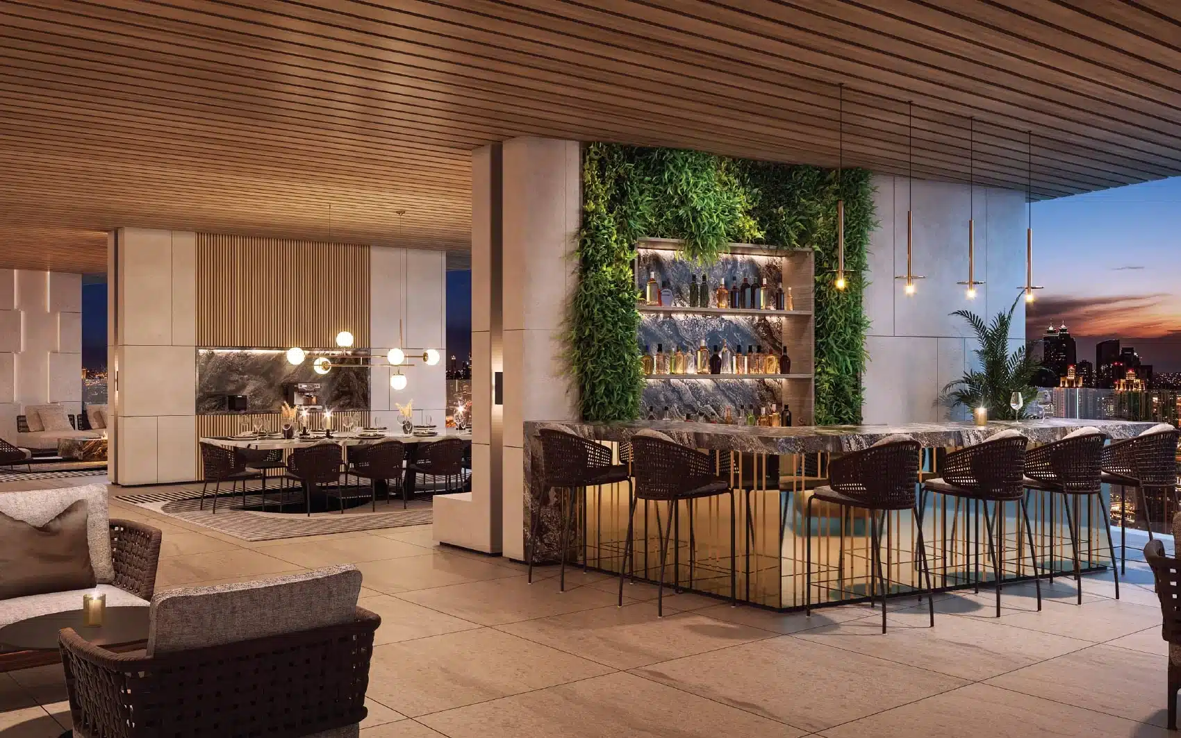 - Upper-floor entertainers’ terrace with outdoor TV room, lounge, bar, and kitchen