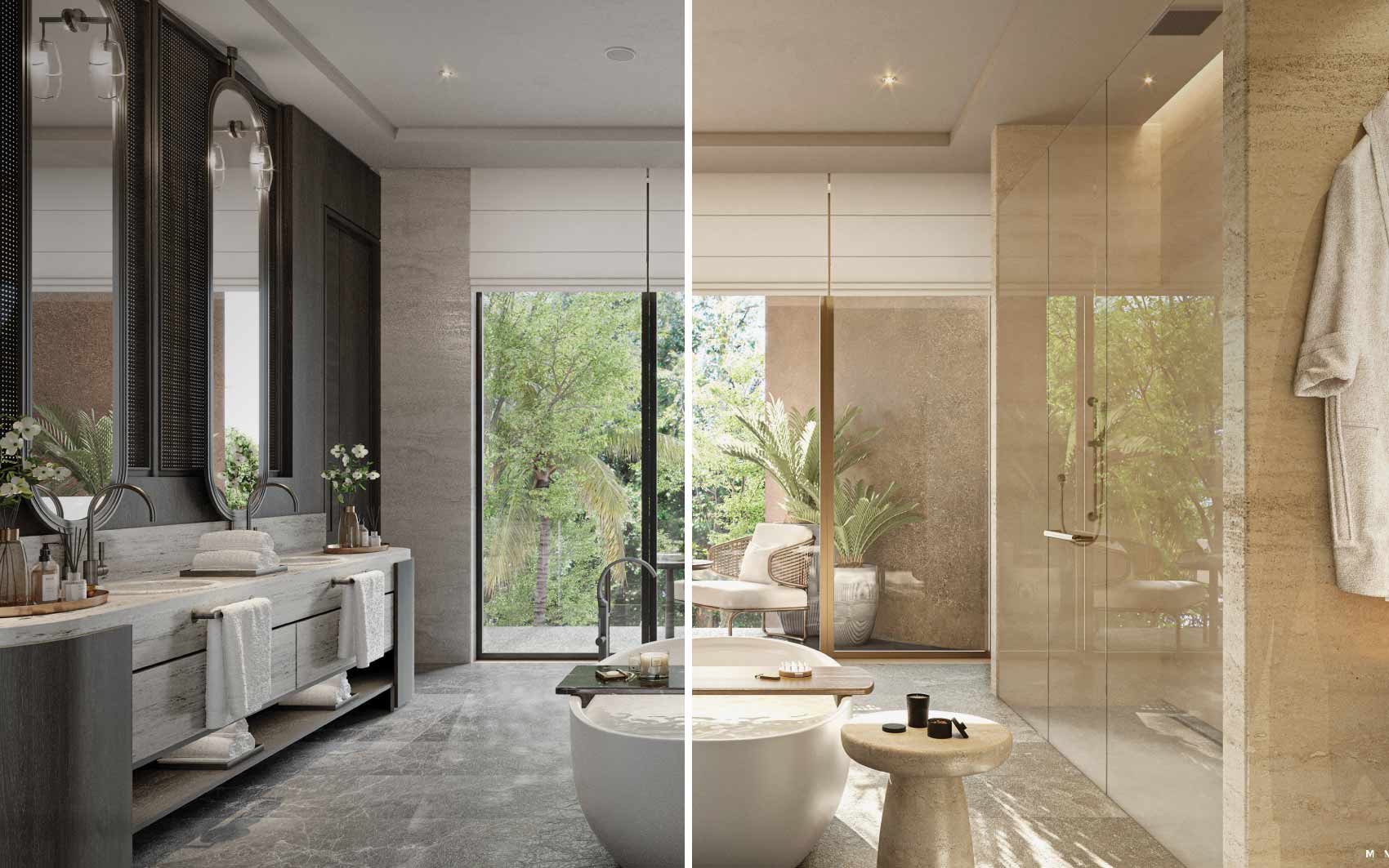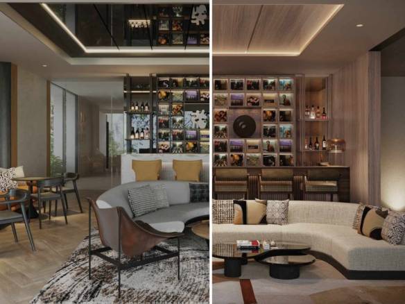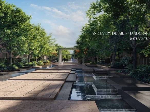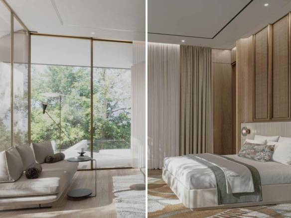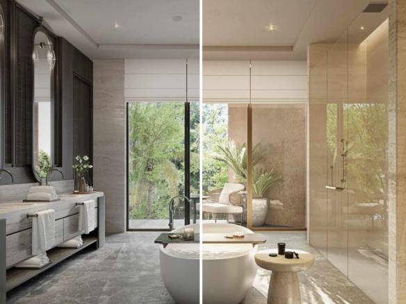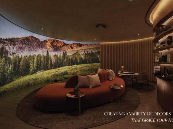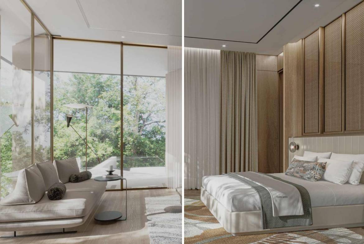 Serenity mansion at Tilal Al Ghaf features numerous additional rooms for staff, including accommodations for maids, drivers, and security. It also includes various specialized spaces across different levels, such as a gym and spa, a nanny’s room, storage areas, IT room, laundry room, and a tea room. The developer offers two exterior finishes, “Earth” and “Ash,” as well as two interior styles, “Moma” and “Uffizi.”