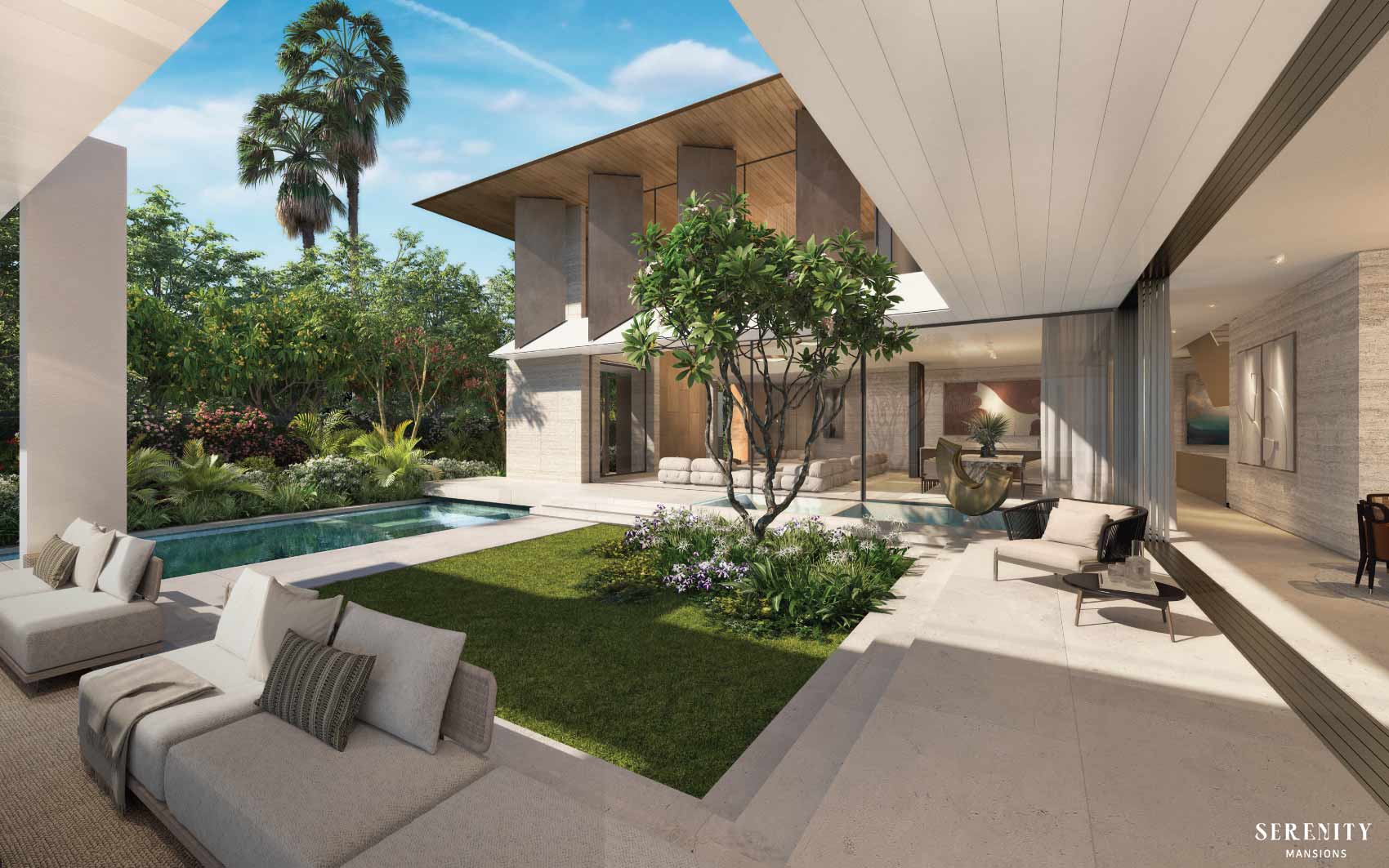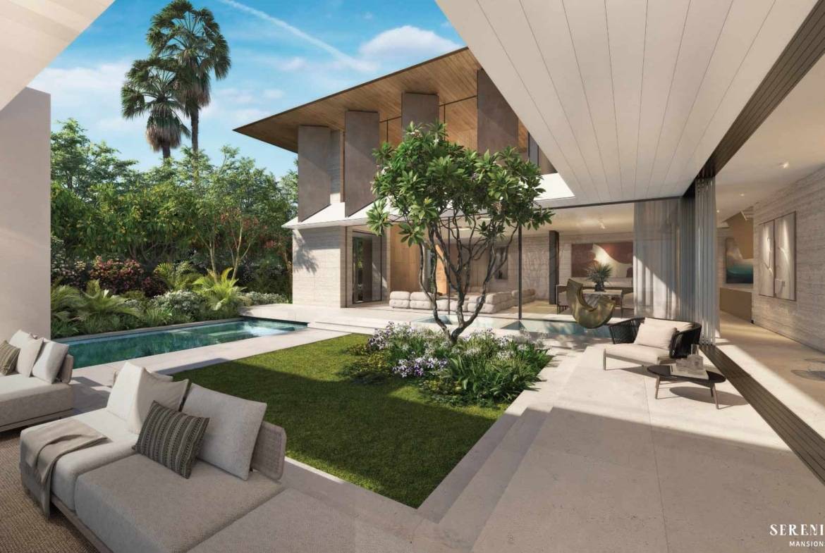 Discover a 7-bedroom Fay lagoon mansion at Serenity Mansions, Tilal Al Ghaf by Majid Al Futtaim. This mansion features a meticulously designed, fragmented structure with a central courtyard that enhances light and airflow. The seamless integration of indoor and outdoor spaces offers unobstructed garden views and a grand double-height lounge ideal for large gatherings.