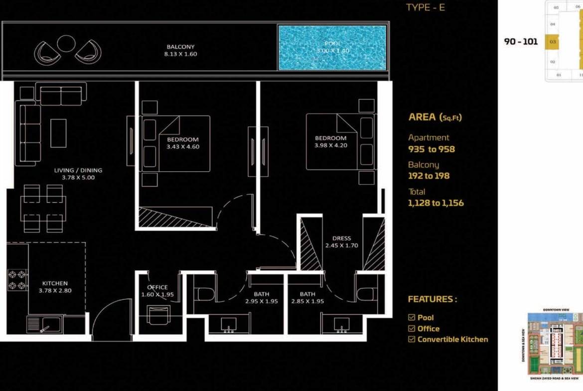 Discover Danube Properties‘ latest masterpiece your sky Home at BAYZ101, a 2-bedroom apartment with a private pool plus study room. Imagine owning a piece of the Dubai skyline at one of the tallest towers in the city and starting each day with stunning panoramic views of the Burj Khalifa and Downtown Dubai.